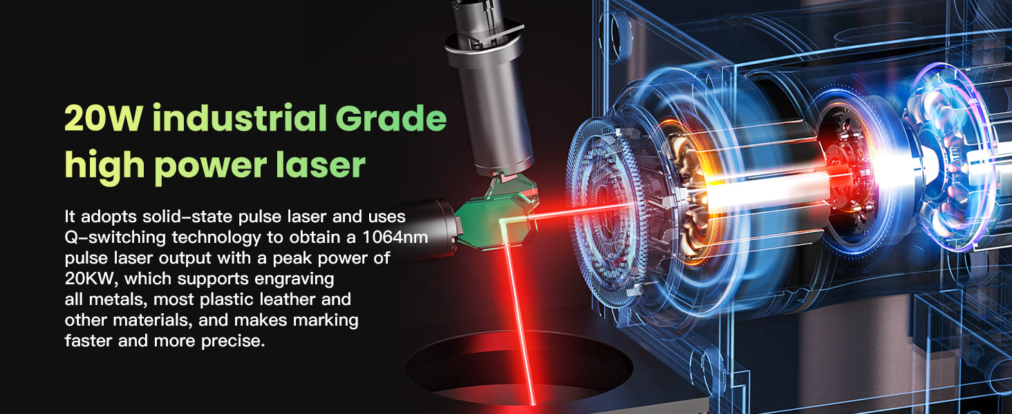 Effortless one-touch batch processing with a 20W high-power, industrial-grade fiber optic marking machine.